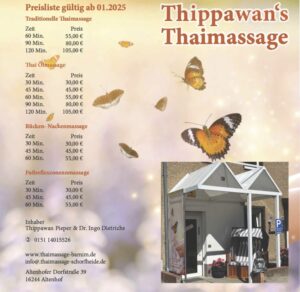Die traditionelle Thaimassage ist eine Kombination von sanften Akkupressuren sowie leichten Streck- und Dehnübungen zur Bearbeitung der Energielinien des Körpers. Diese Energielinien werden in einer Weise beeinflusst, welche Verspannungen abschwächt sowie Kreislauf und Stoffwechsel anregt. Die verstärkte Durchblutung von Bindegewebe und Muskulatur führt zu einem Wohlbefinden und einer erhöhten Vitalität.